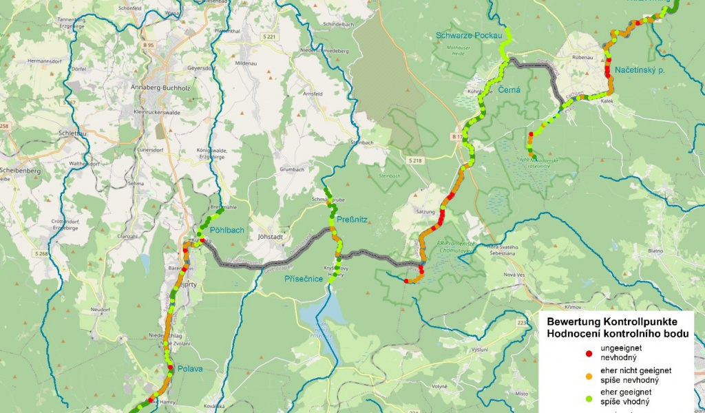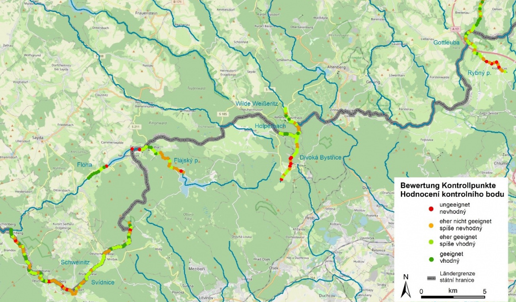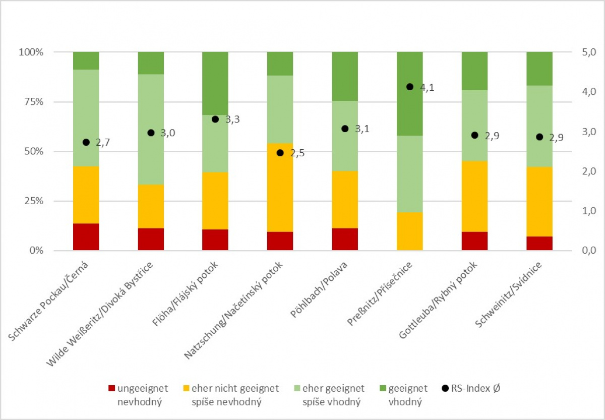 Habitatbewertung anhand möglicher Rast- und Ruhestätten Als besonders geeignetes Migrationsgewässer mit einem durchschnittlichen RS-Index von 4,1 (= eher geeignet) stellte sich die Preßnitz/ Přísečnice heraus. Sie weist keine Abschnitte ohne wertvolle Habitatrequisiten auf. Auch Flöha/Flájský potok, Pöhlbach und die Wilde Weißeritz mit Holperbach/ Divoká Bystřice bieten mit einem mittleren RS-Index von 3,0 bis 3,3 noch gute Wanderbedingungen durch die vorhandenen Rast- und Ruhestätten. Eine mittlere Habitateignung zeigten mit einem RS Index von 2,7 bis 2,9 die Natzschung/ Načetínský potok, das Schwarzwasser/ Černá, die Gottleuba/ Rybný potok sowie die Schweinitz/ Svídnice. Keines der Gewässer war insgesamt als ungeeignet einzustufen. Aber auch Gewässer mit uneingeschränkter Habitateignung fehlen im Gebiet.