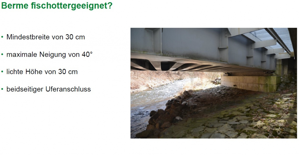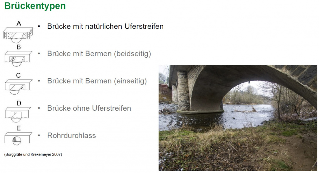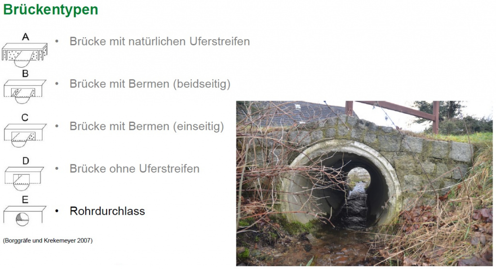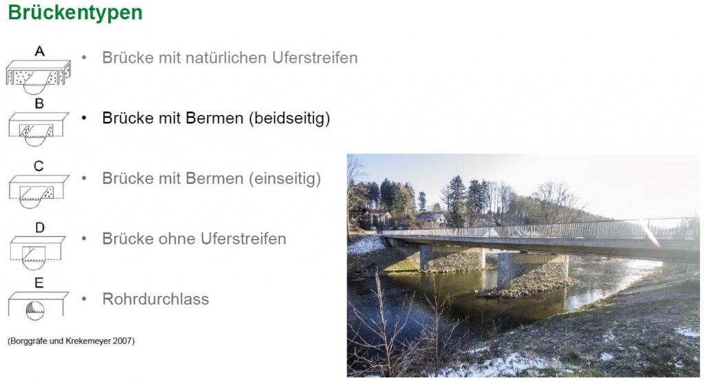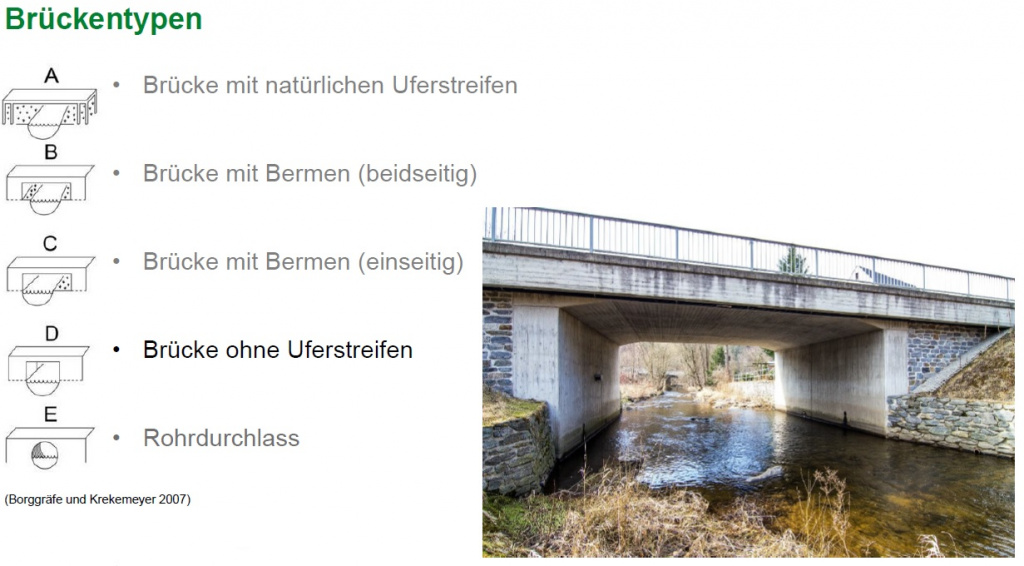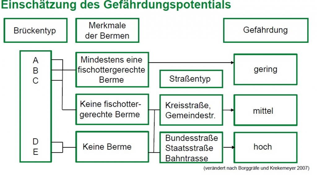 Um Migrationshindernisse und Gefährdungsstellen zu identifizieren, werden an allen ausgewählten Fließgewässern des Projektgebietes Brücken, Wehre und andere Ausbreitungsbarrieren dokumentiert und hinsichtlich ihrer Gefährdung für querende Otter eingestuft. Ausschlaggebend sind hierbei Merkmale wie die Art der Ausbreitungsbarriere, das Vorhandensein von Uferrandstreifen oder Bermen sowie (bei Straßenbrücken) der querende Straßentyp. Ist ein Uferrandstreifen oder eine Berme vorhanden, so erfolgt die Einschätzung, ob der Fischotter diese zur Unterquerung nutzen könnte. Dazu sollte die Berme breit genug (mindestens 25cm) und nicht zu stark geneigt sein (max. 40°). Außerdem sollte ein beidseitiger Uferanschluss vorhanden sein und die lichte Höhe mindestens 30 cm betragen. Sind diese Kriterien erfüllt, wird das Querungsbauwerk als passierbar eingestuft. Bei unpassierbaren Bauwerken erfolgt eine Einschätzung der Gefährdung an Hand des Straßentyps. Bei Fußgängerbrücken oder Waldwegen ist die Gefährdung als gering einzustufen, wohingegen bei Bundes-, Staats- oder Kreisstraßen die Gefahr, dass der Fischotter zum Verkehrsopfer wird, deutlich erhöht ist. Jede Gefährdungsstelle wird auch auf Nutzungsspuren des Fischotters geprüft. Die dabei eventuell vorgefundenen Kotspuren werden in Kategorien von sehr frisch bis sehr alt eingeteilt. Besonderes Augenmerk wird auch daraufgelegt, ob das Bauwerk für das Aufstellen von Wildkameras geeignet ist, um Wanderungsaktivitäten auch im Sommerhalbjahr zu erfassen.