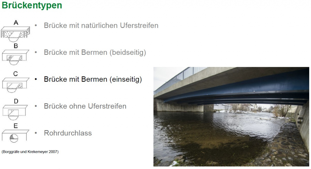 | Ort Straße Koordinaten | Brückentyp Uferstreifen Berme | Berme fischottergeeignet | Straßenart Gefährdung | Losungsfund Kategorie | Eignung Monitoring |